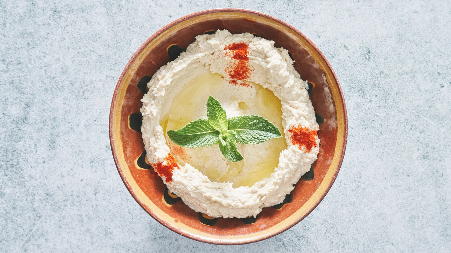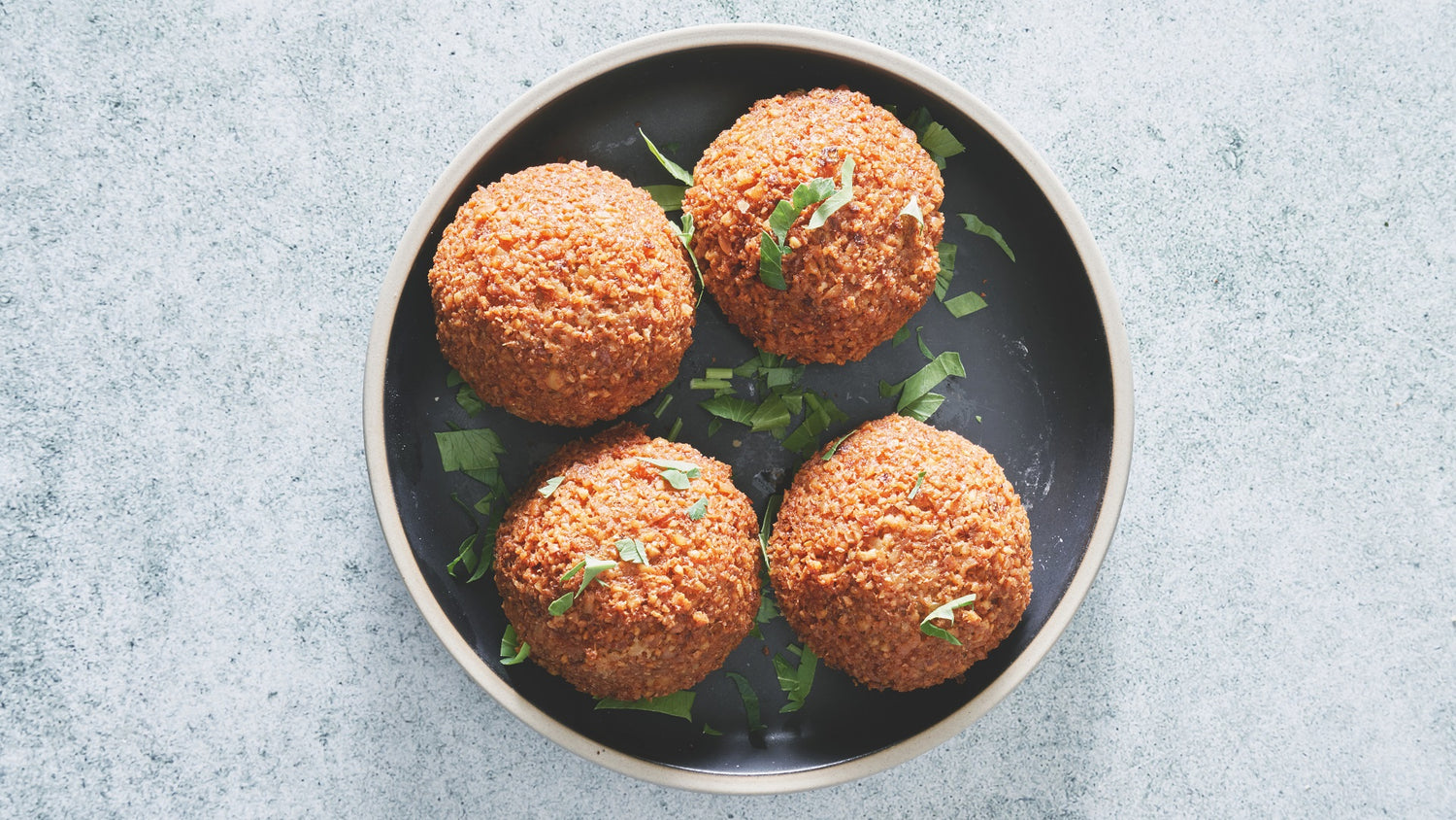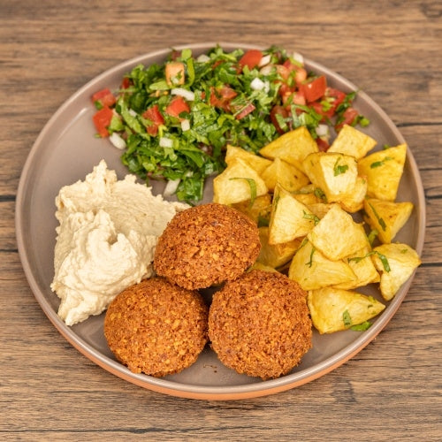 Falafel, kartofler stegt i koriander og hvidløg, tabouleh-salat, hummus.