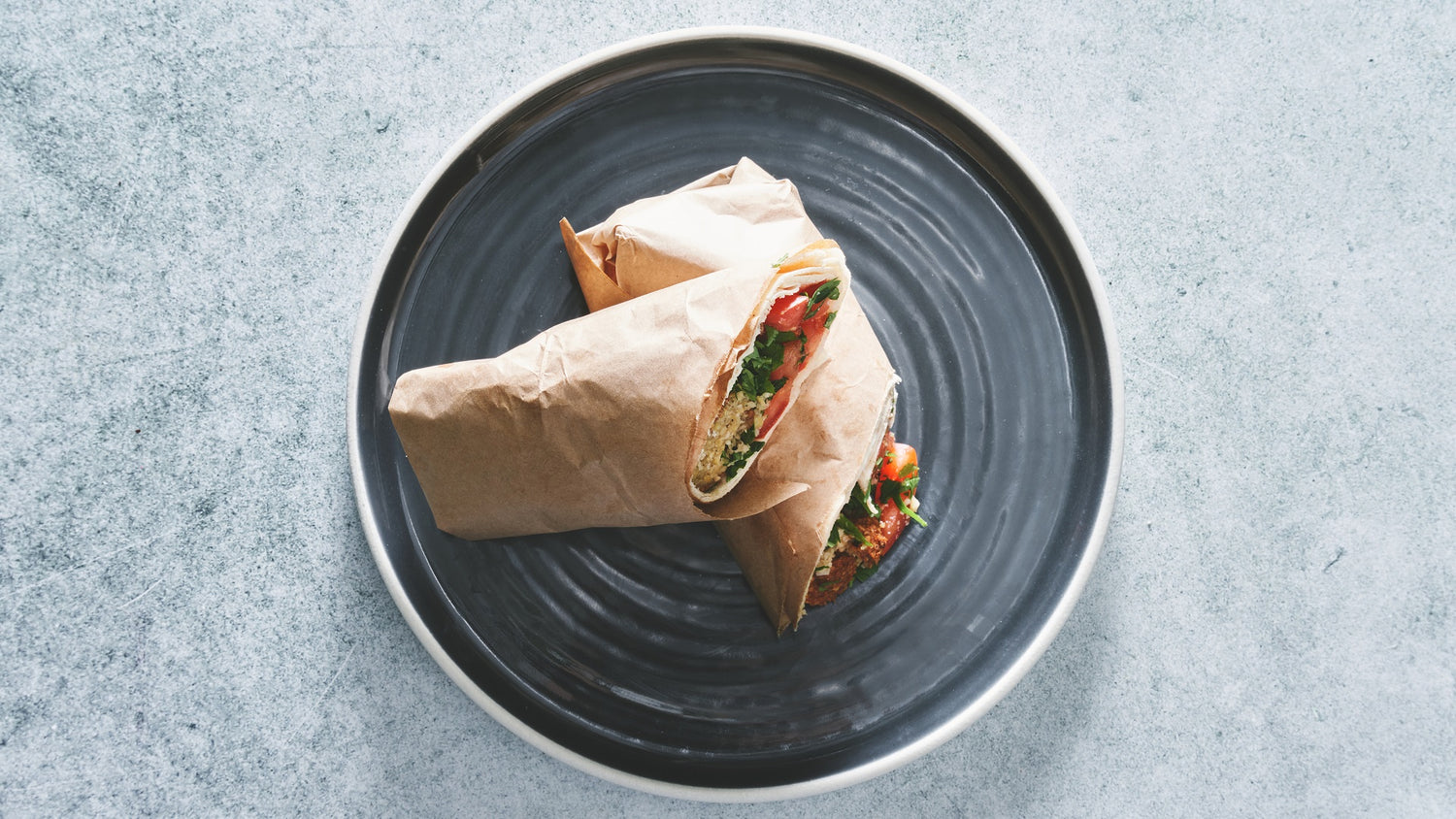 Falafler med grøntsager og tahine-sauce – svøbt i arabisk brød.