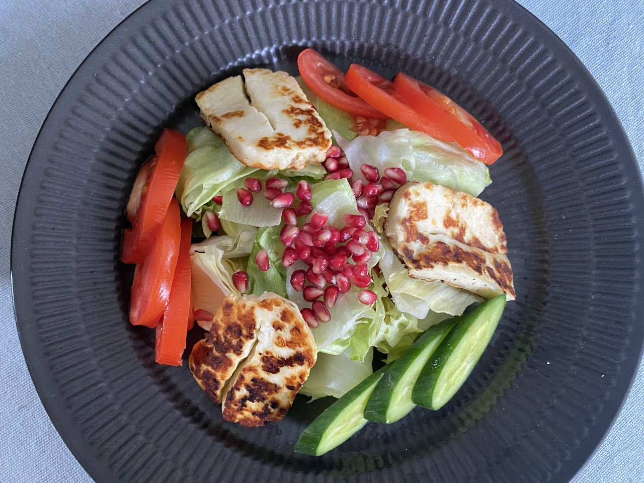 Grillet halloumi, salat, tomater, agurk, granatæble, dressing.