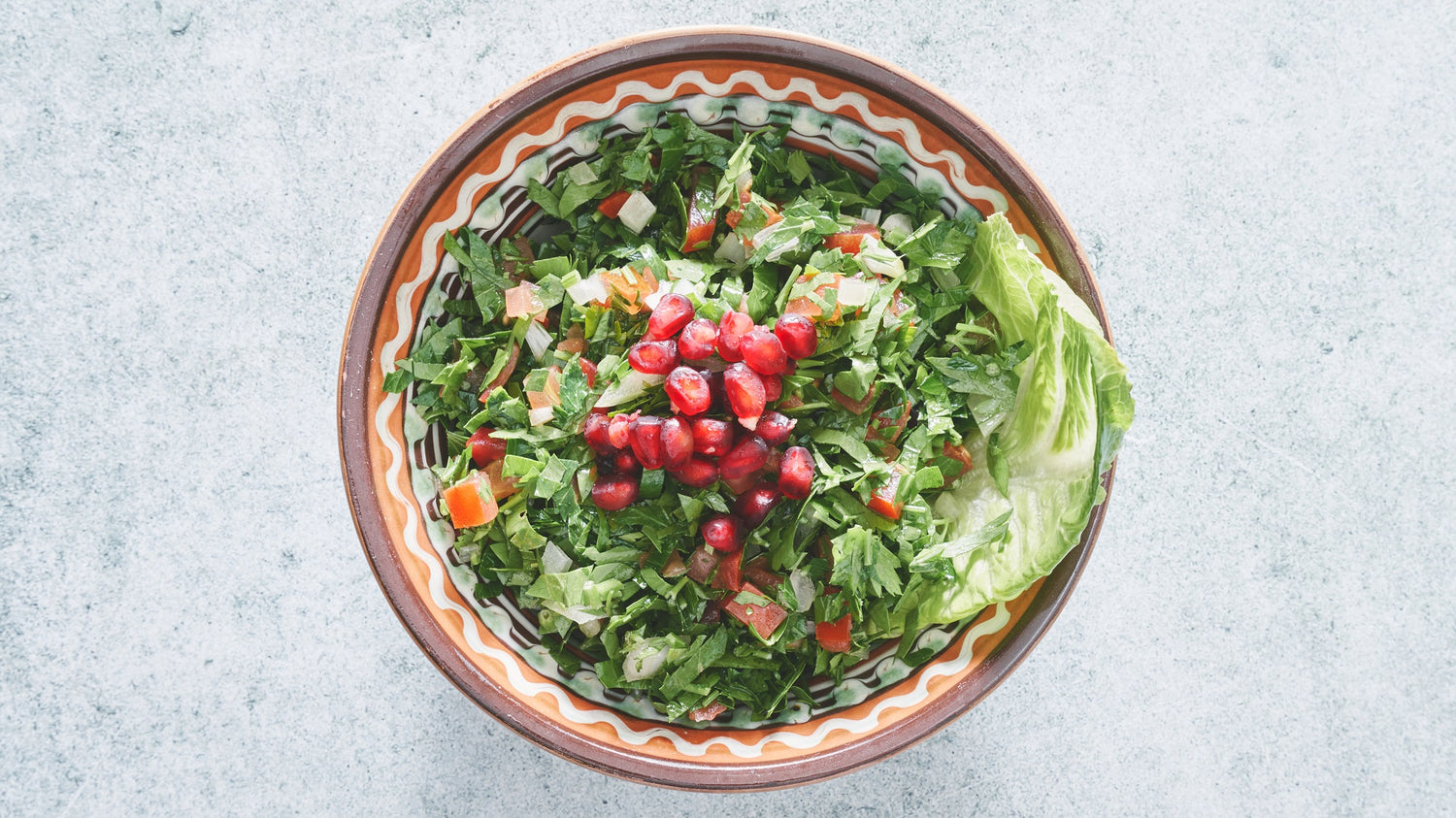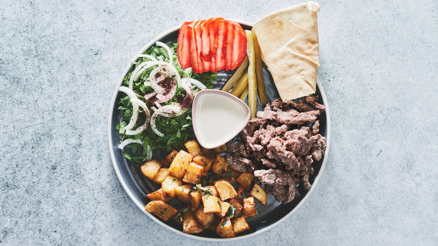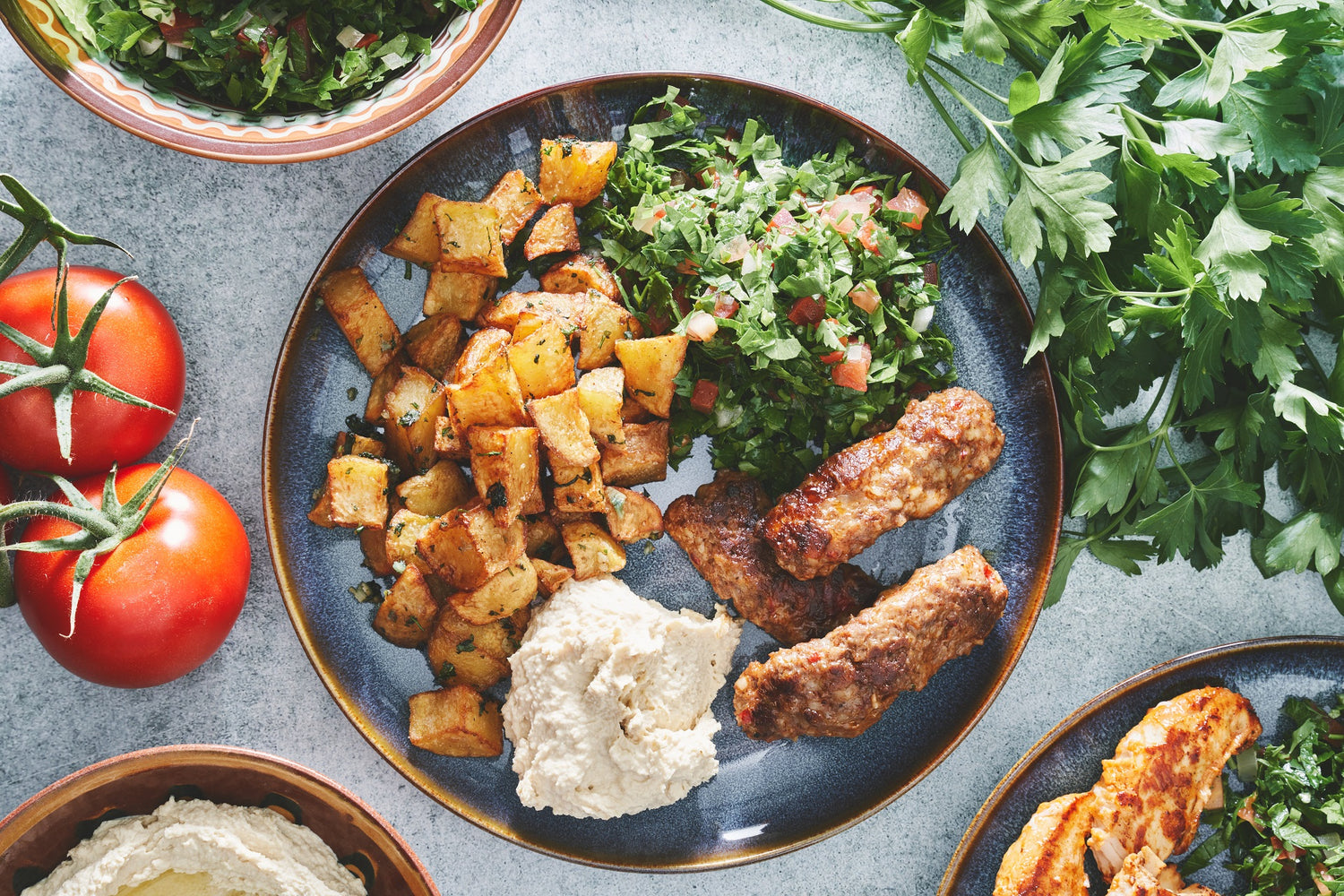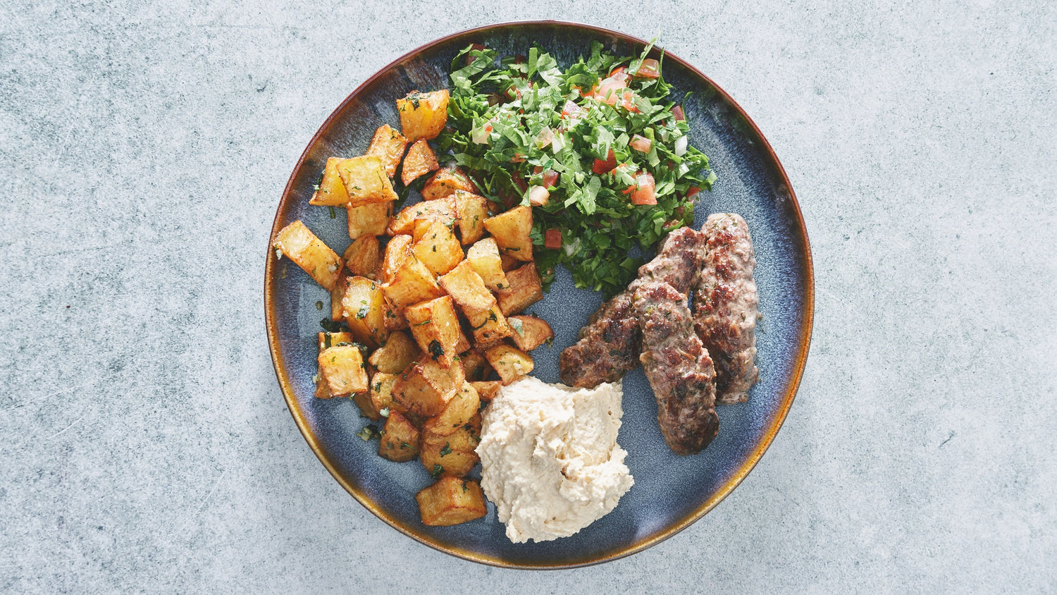 Oksekød med persille og løg, kartofler stegt i koriander og hvidløg, tabouleh-salat, hummus.