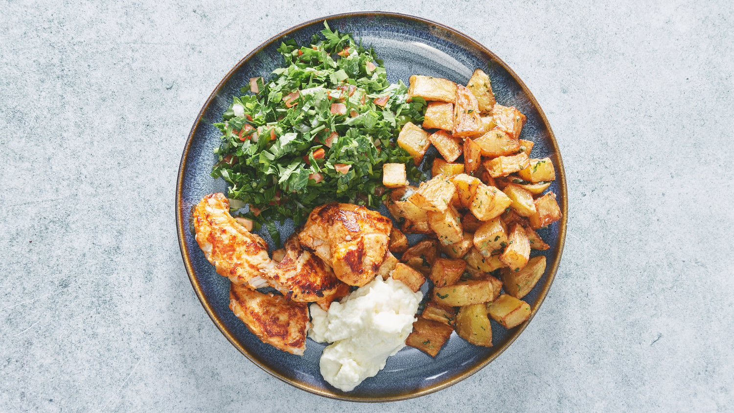 Kylling, kartofler stegt i koriander og hvidløg, tabouleh-salat, hvidløgsdressing.